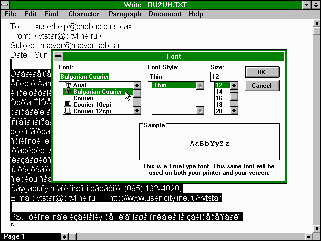 I downloaded the message to my machine and made a search for a font with a Cyrillic character set. I found a site with such fonts and downloaded one and installed it on my system. I then logged off, entered Windows and opened the file with Write, making sure I selected no conversion to Write format: