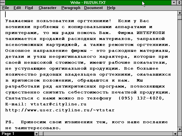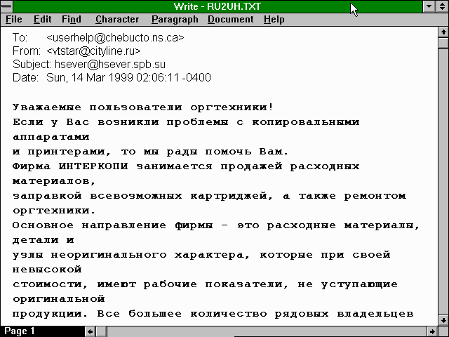 A message to userhelp arrived in my mailbox last March that I couldn't read. It was in Russian. I had no way of telling whether this was a query to userhelp about CCN or just another piece of junk email (a.k.a. 'spam').