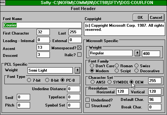 I also was able to use the Softy font editor to create an edited version of the font used in a DOS box in Windows. Getting the system to use it with Windows 3.1 was a bit of a problem. Windows 95 users have it easier here. It is possible to select the font used in a DOS box on a window-by-window basis. (Gack! I can't believe I just said something nice about Windows 95. OK, so my bias is showing.) For some reason, Windows 3.1 wouldn't accept my changes to the default fonts and would reselect one of the already-installed Terminal fonts as the default font for a DOS box. My solution (which may not be optimal) was to: