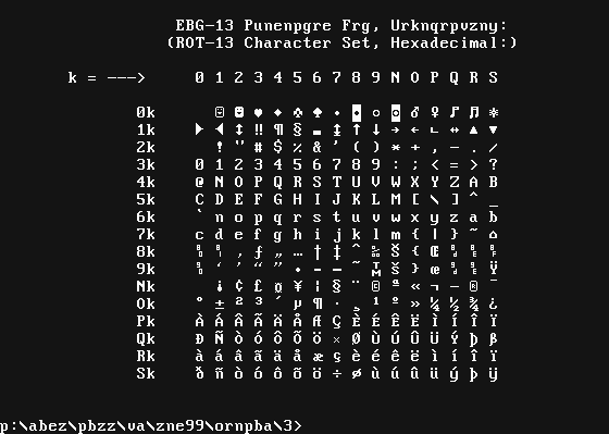 [a screen shot of the ROT-13 VGA character set.]