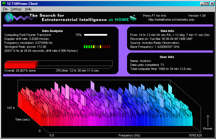 Chances are, your computer isn't working as hard as it could be. Much of the time most computers sit around, twiddling their virtual thumbs, waiting for the next excruciatingly slow key stroke or mouse movement. Millions of operations a second of wasted processor time multiplied by millions of computers around the world. This is changing though with the notion of distributed computing which sees wasted processor time as a vast untapped resource. Still in its early stages, distributed computing uses the processor time that you don't use on your computer to work on some larger project. The larger project is broken down into smaller pieces, sent out to computer users all over the world who have signed up to take part in the project, then processed, and the results sent back and a new piece downloaded. The project gets the equivalent of a giant supercomputer working for them for free and the volunteers who make up the supercomputer get the satisfaction of working on something they believe in, or increasingly, the possibility of money. One of the first organizations to tackle the notion of distributed computing was SETI, the Search For Extra Terrestrial Intelligence. This group searches the skies for signs of intelligent life in the form of radio signals. Funding for this kind of research tends to be scarce in the commerce-driven world we live in, but undaunted, scientists at SETI have become masters in conserving resources and making do. Getting time on overbooked radio telescopes is expensive so they designed Project SERENDIP to run on radio telescopes engaged in other tasks to collect raw data for SETI. Processor time for the kind of number crunching needed to examine this data is very expensive indeed so a group at the University of California at Berkeley developed SETI@home to run as a screensaver and in the background on home computers. It was (and is) successful beyond their wildest expectations. It turns out that there are a lot of people willing to help out who never had the ability to do it before.
