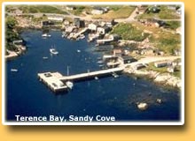 Located southwest of Halifax, the quiet fishing village of Terence Bay lies just 10 km. off the Prospect Road, Route 333. Terence Bay village consists of six distinct settlements known as "Lower Prospect", "Back Bay", Sandy Cove", "Terence Bay", "Up the River" and "Across the River" Over the centuries this peninsula has been called Terrant's Bay, Tern Bay, Turner's Bay and Turner Bay Rock. Landmarks in the village are a cairn that stands as a memorial to those who lost their lives when the "SS Atlantic" sank on April 1, 1873 off the coastline of Terence Bay and Lower Prospect, and a lighthouse on Terminal Point.