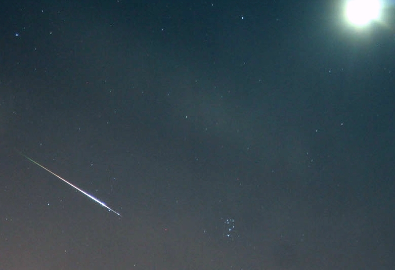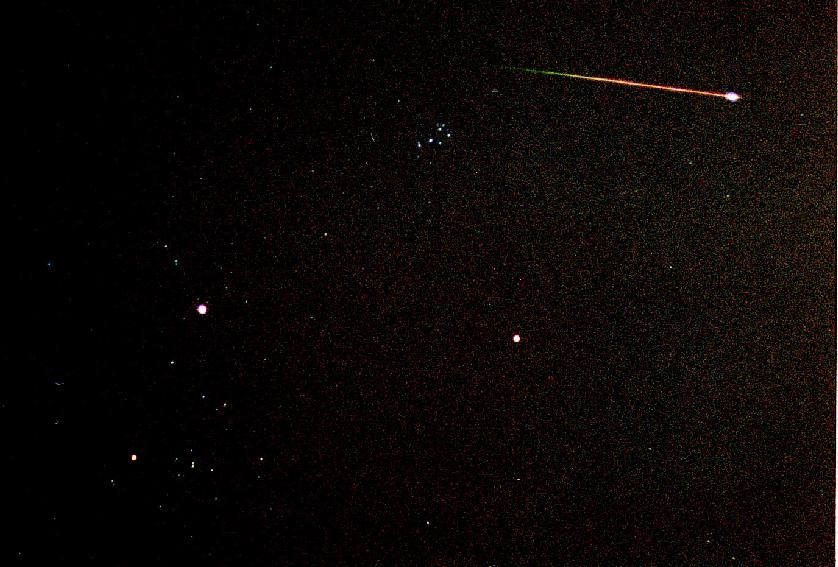 The two bright objects are Jupiter to the left, Saturn to the right, M45 also known as the Pleiades were the meteor starts, and the "V" shaped Haydes cluster is below Jupiter. The photo was taken from my balcony in Halifax, Nova Scotia, Canada on November 17/18, 2000. I had just started the exposure when the fireball appeared. I used a Soviet made Zenit B camera with a 50 mm f/1.8 lens and Kodak Gold 400 ASA film.