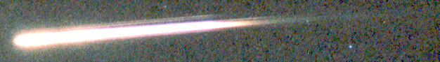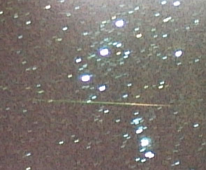 The photo was taken from the roof at Dalhousie University in Halifax, Nova Scotia, Canada. I used my Soviet Zenit-B camera with a 50mm f/1.7 lens and Kodak Gold 400 ASA film. The -6 fireball occured about 1020 UT near Orion in the southwest just as twilight was begining in the east. The Moon was still above the horizion and to the right of the area, but was covered by clouds. As I started the exposure I was distracted by another Leonid and lost count on the exposure time, which was past 40 seconds. The fireball left a 1 second trail and produced a slight terminal burst at the end. I was lucky, after the film was developed I noticed that it was on my last frame!
