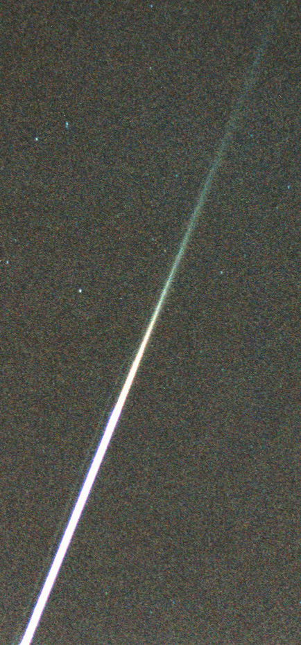 The images go from the longest one as I first saw it about max altitude above horizion near the constellation Delphinus and the two shorter images as it began to descend towards the SE, were the last image it was starting to go into clouds over the ocean nearing the end of it's burnup. Note a "fragment" to the left of two images. I used my Soviet made Zenit-B camera with a 50mm f/1.7 lens and Kodak Gold 400 ASA film. The exposures are close to 10 seconds +/- 5 seconds. I shot the photos from the roof of Dalhousie University in Halifax, Nova Scotia, Canada. Lat== N44d 36' Long= W63d 36'