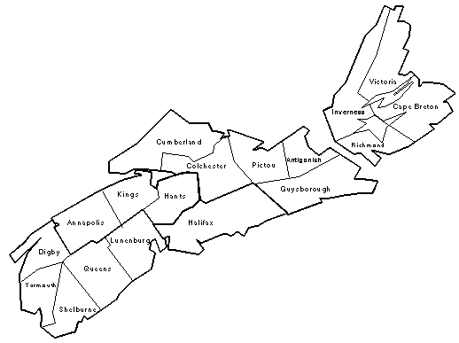 For the benefit of those researchers unfamilier with the geography of Nova Scotia, here is a map showing the boundaries of the various counties: