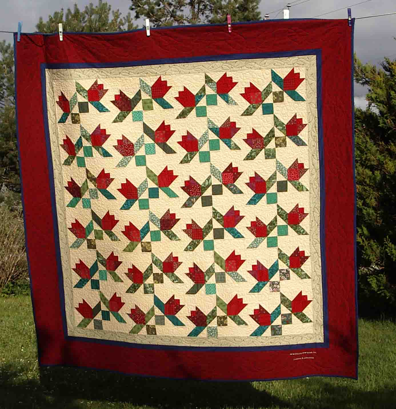 "Tulips" is a lap quilt 68" by 68" and made from scrap pieces of reds, greens, and teals. The pattern is from a design by Susan Murphy.
