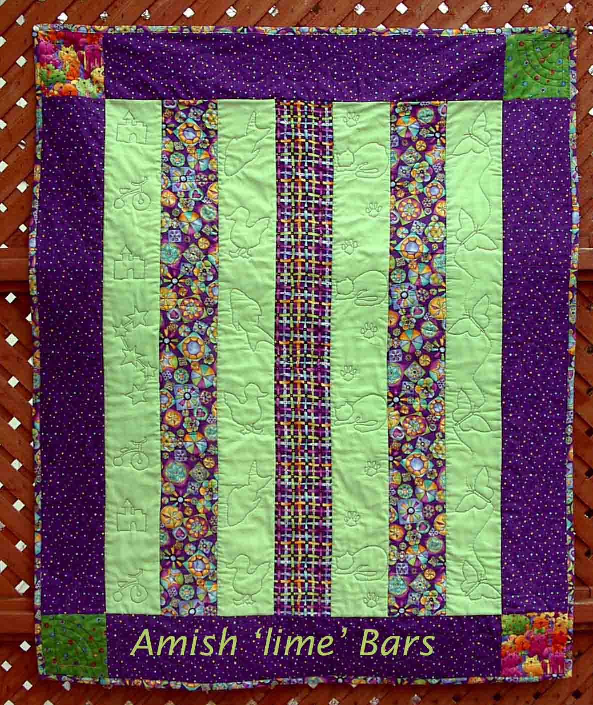 Maeve's Amish Bars - lime - is another baby quilt 38 by 46 inches, with purple borders, free motion quilted; my first FM project. Traditional.