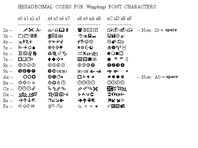 To see the entire selection of characters available in the Wingdings font that may be chosen for your screen-saver, those with graphical browsers can view the graphic file wingding.gif which is a screen-shot of all of the usable Wingdings characters in a Word document.